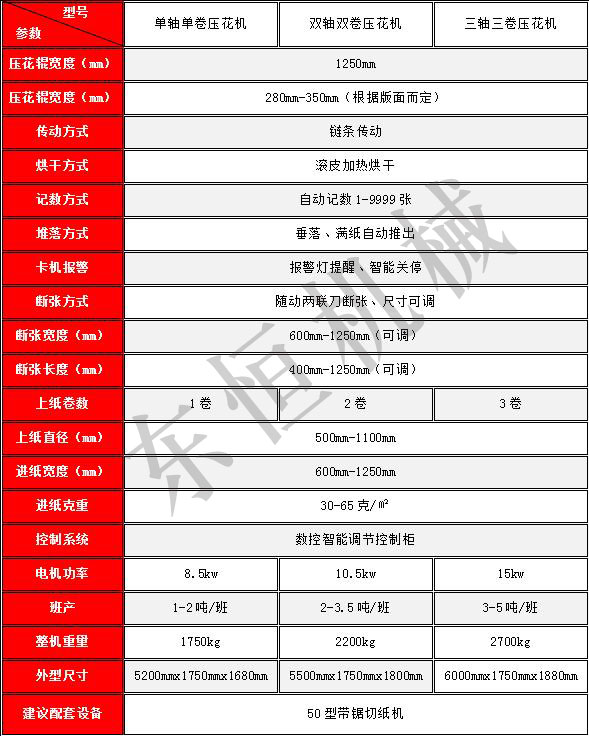 將大軸紙經(jīng)過專業(yè)制作的凹型花紋鋼棍和富有彈性及耐溫的毛棍相對(duì)壓,使原來的平紋紙對(duì)壓成各類花紋及紋路的泡紙,且對(duì)壓后的泡紙高度可通過兩棍對(duì)壓的壓力自行調(diào)節(jié),自動(dòng)電子計(jì)數(shù),自動(dòng)裁切!